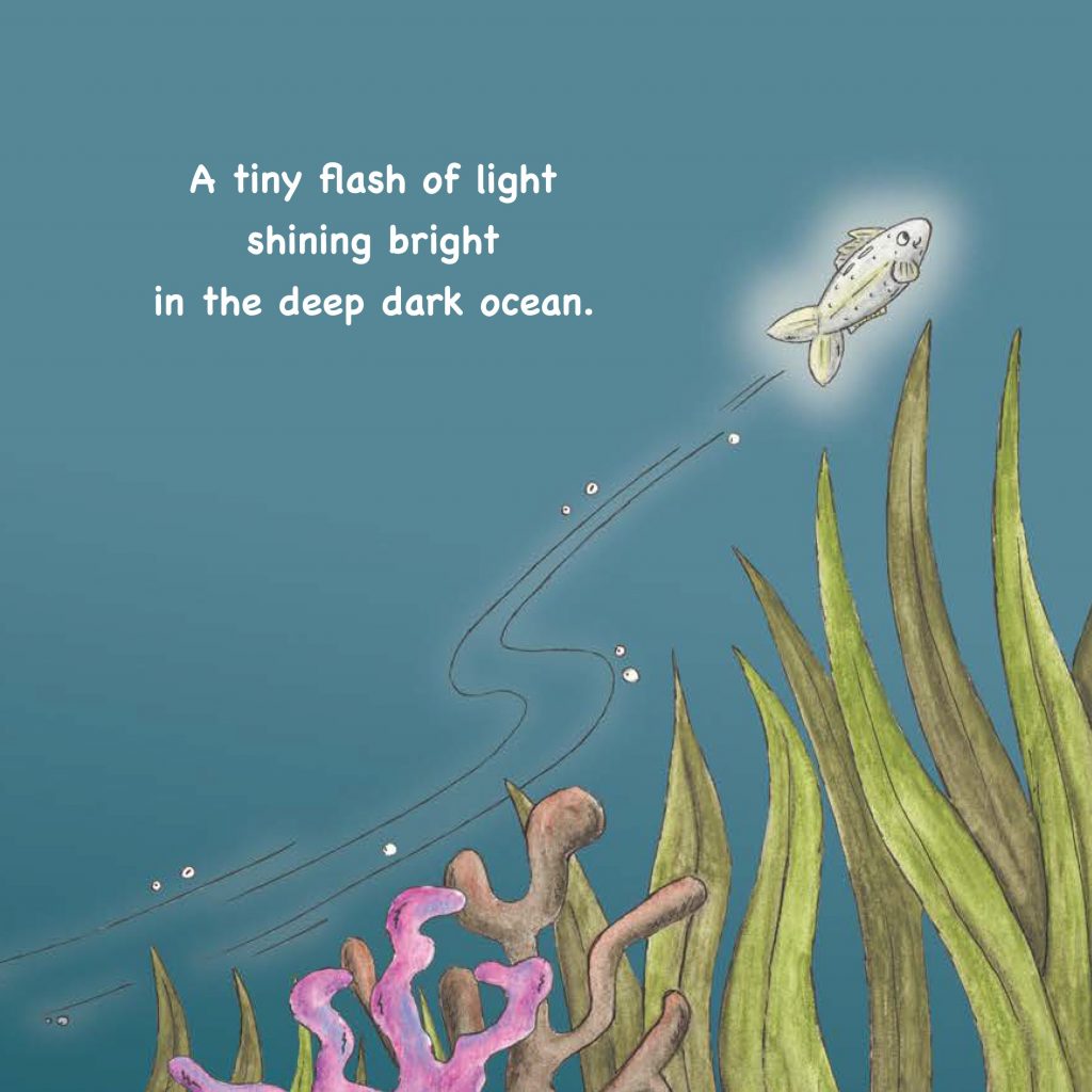 Trish the Fish may be teeny tiny but she can swim very fast. She shoots through the water – swish, swash, swoosh! A tiny flash of light shining bright in the deep dark ocean.