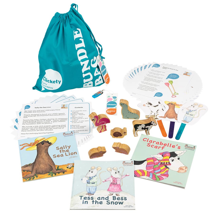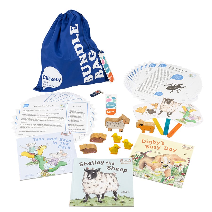 Each bundle includes 3 Early Soundplay Books, wooden animals, a USB stick with MP3 audiobook files, easy to print PDF’s with guidance, lolly stick puppets, colouring sheets and activities. Each bundle comes with a colourful cotton drawstring bag.