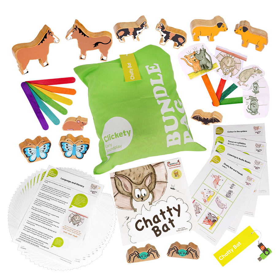 Chatty Bat’s Bumper Story Bundle, with wooden animals, provides lots of opportunities for fun language and sound play activities.