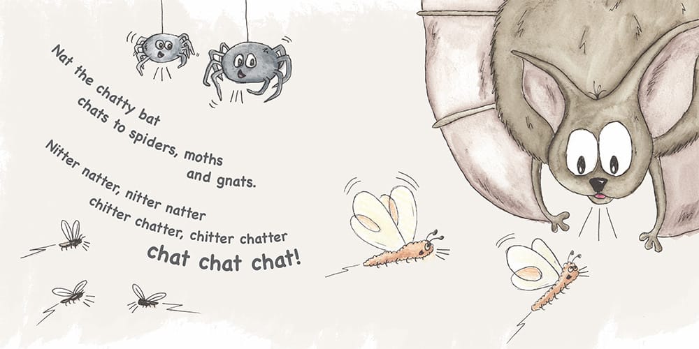 Chatty Bat is small and fat and loves to chitter chatter chat with all her friends. It’s very noisy with constant chatter until it’s time to sleep – then no more chatter, not a peep!