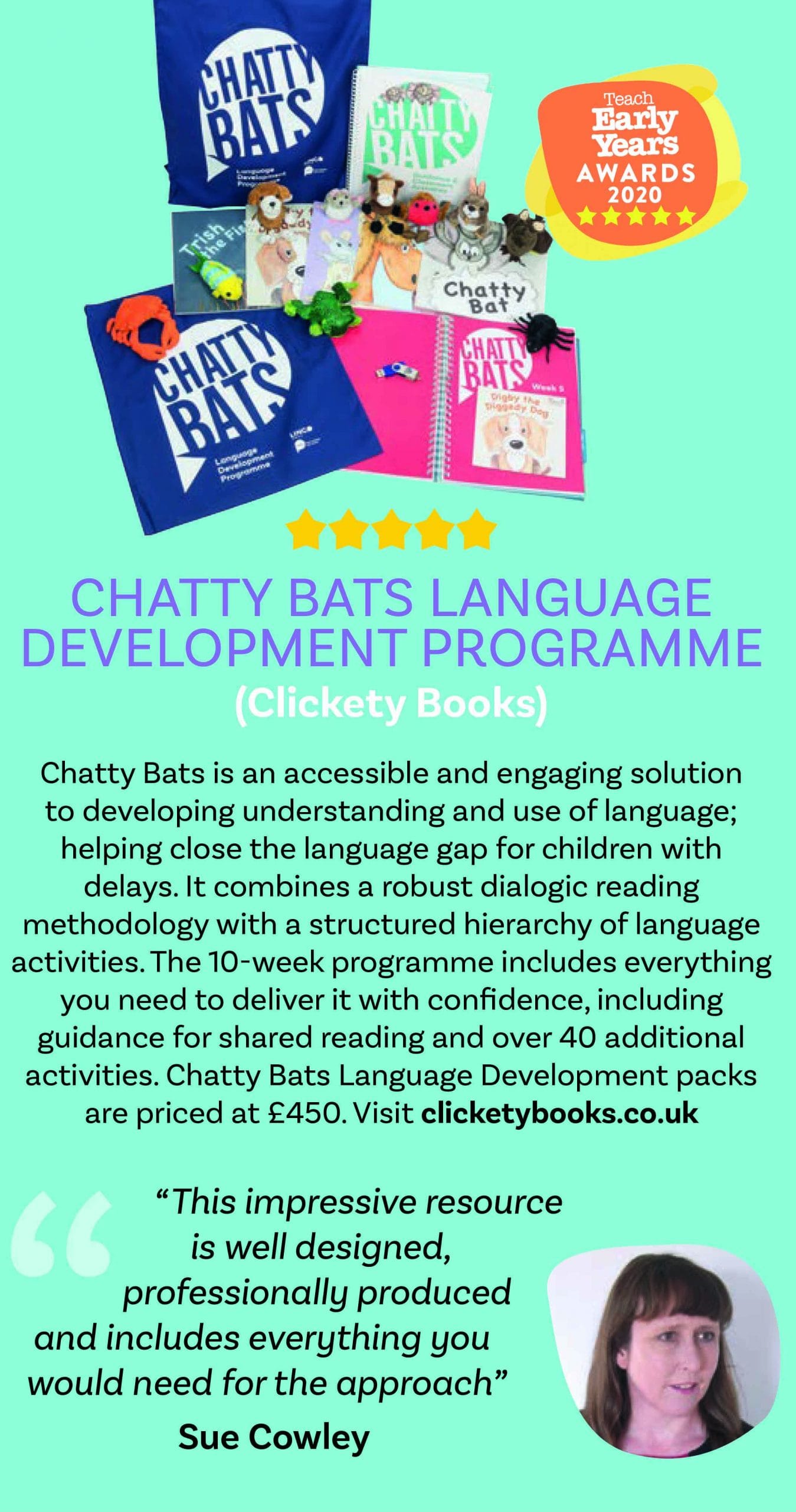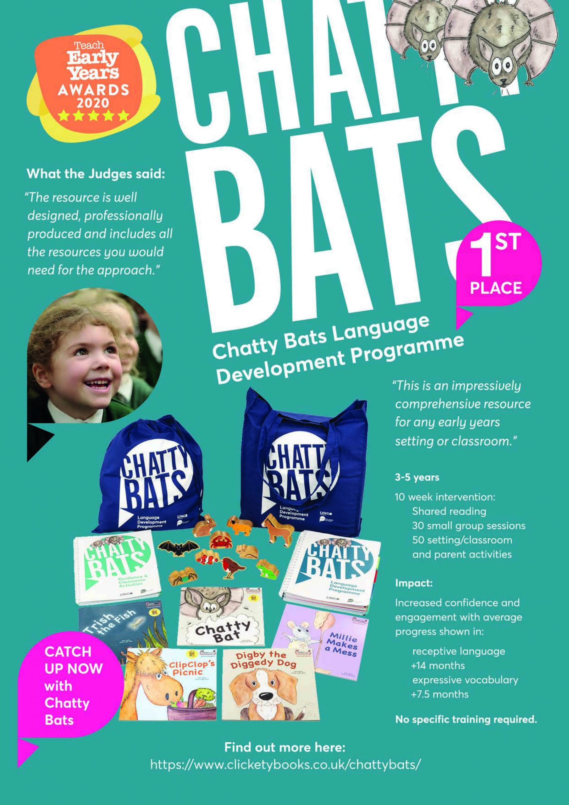 ‘Chatty Bats is an accessible and engaging solution to developing understanding and use of language; helping close the language gap for children with delays. An impressively comprehensive resource for any early years setting or classroom.‘