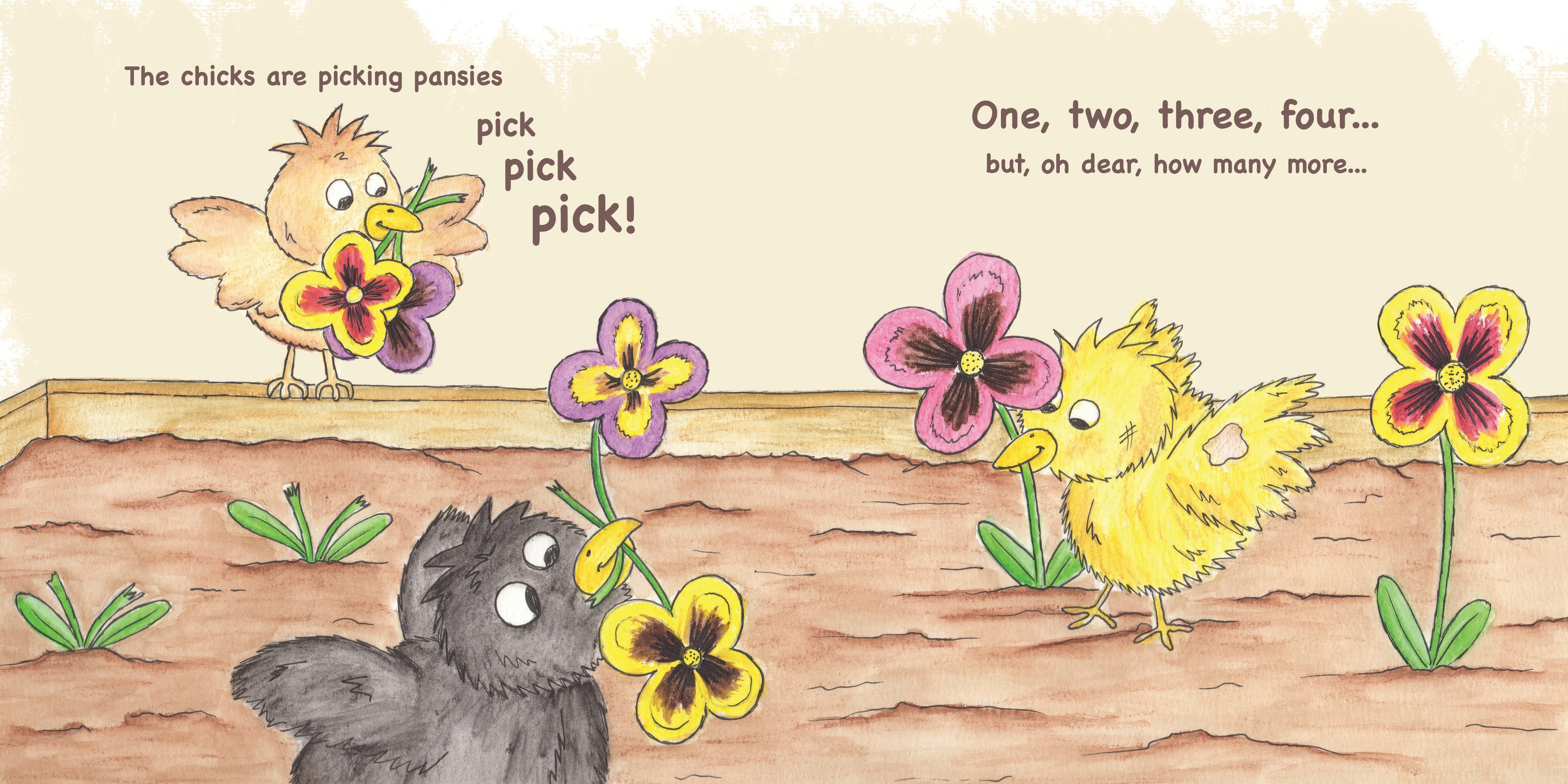 Erica’s Chicks – Erica has three chicks: messy Mick, naughty Nick and another little rascal Rick. While Erica snoozes in the sun the chicks are having lots of fun!