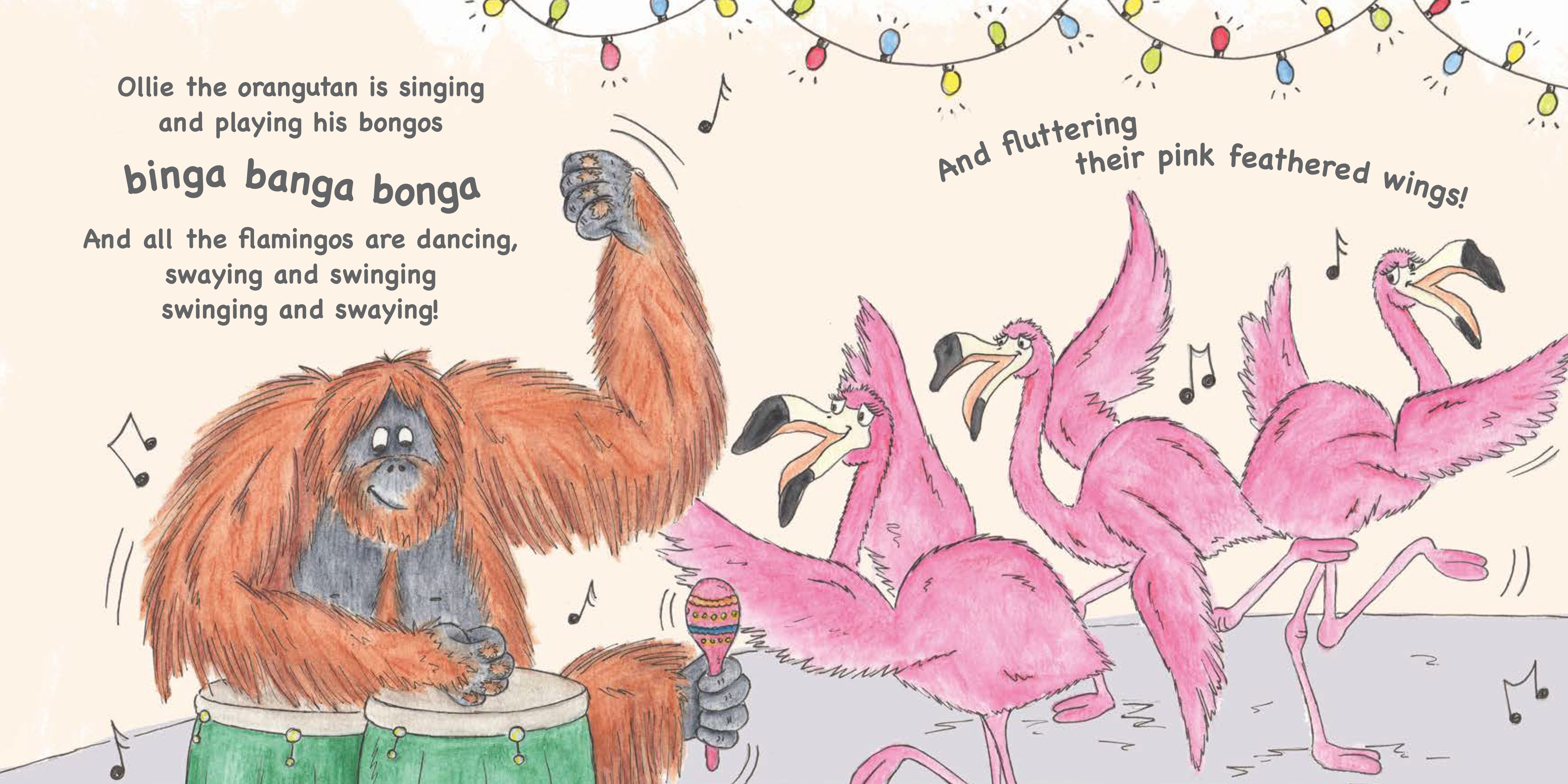 Ollie the orangutan is singing and playing his bongos – binga banga bonga. All the flamingos are dancing, swaying and swinging, swinging and swaying! And Flo is jingling and jangling and fluttering her pink feathered wings.