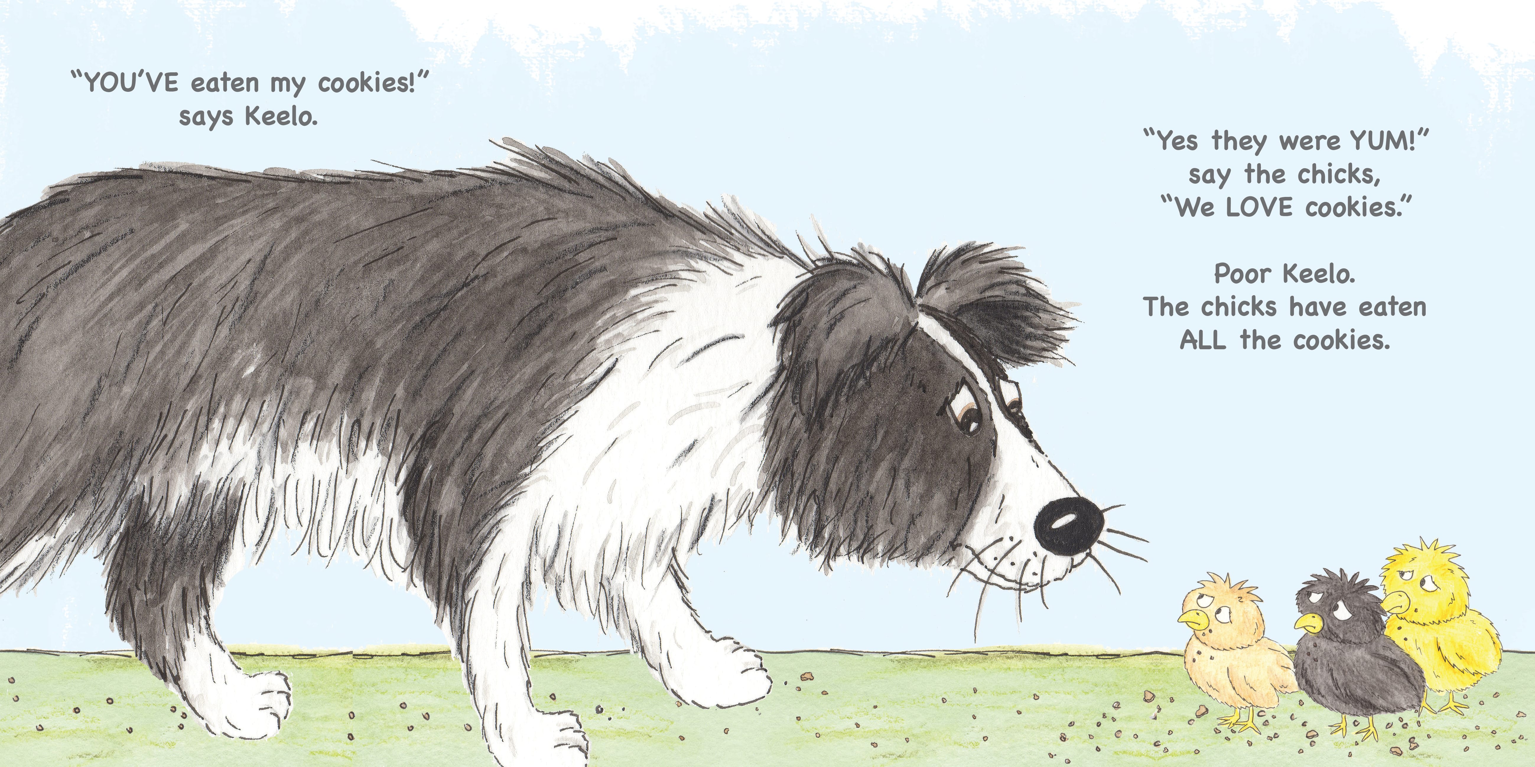 Keelo’s Cookies: Keelo can’t find his cookies, just a trail of crumbs … “Have you eaten my cookies?” he asks his friends. The trail leads to Erica’s chicks – have they eaten his cookies?